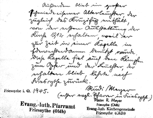 „Diese Altarbibel befand sich bei Gründung der Kirchengemeinde 1935 in der Kapelle in Friesoythe, dort wahrscheinlich bei der Einweihung 1912 gestiftet. 1945, am 15. April, dem Sonntag Misericordias Domini nahm ich die Bibel zu meiner persönlichen Benutzung aus der Kirche, als feindliche (kanadische) Truppen das Pfarrhaus in Brand gesetzt hatten und ich und meine Familie nichts, nicht einmal eine Bibel, gerettet hatten. Eine Stunde später wurde auch die Kirche angezündet und mit allem Inventar, bis auf die im feuersicheren Schränkchen in der Wand der Sakristei untergebrachten Abendmahlsgeräte, ein Raub der Flammen. So wurden die Bibel und das Abendmahlsgerät als Einzigstes aus dem Besitz der Kirchengemeinde gerettet, die im übrigen alles (Kirche, Pfarrhaus, Kirchen-bücher, Akten, Rechnungsbelege u.s.w.) einbüßte. Alles Äußere (Gebäude, Orgel, Glocke,Talar, Papiere) ging verloren. Nur diese Bibel und der Kelch blieben: Wort und Sakrament!